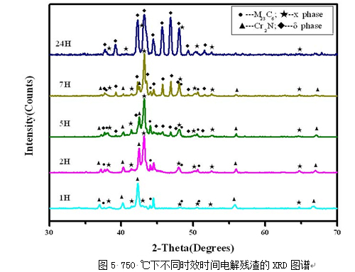 (2)750 ℃時效1 h后,析出相主要是以M23C6和Cr2N為主, 到2小時,χ相開始形成;5 h以后則有部分σ相出現(xiàn),而后伴隨著時間的延長,σ相越來越多,相應χ相開始減少,到24 h時,σ相已經(jīng)占主導地位,且形成的晶體很完整,XRD圖譜峰和清晰明顯。