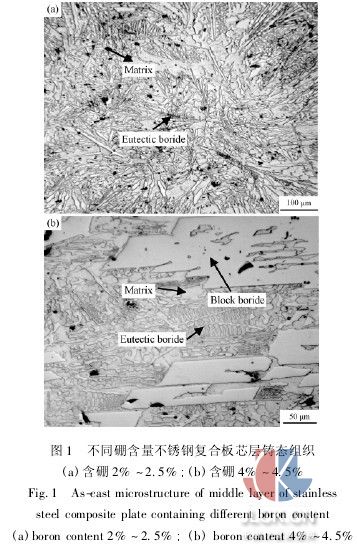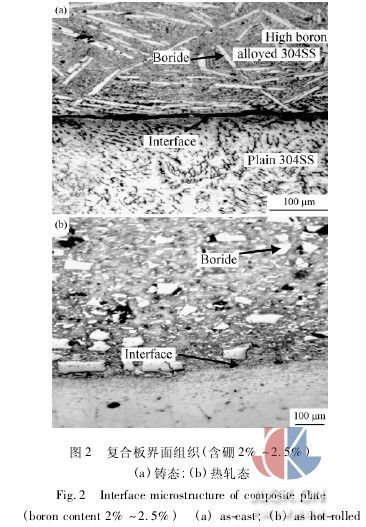 采用10kg真空熔煉爐在0.1kpa的真空條件下熔煉并澆鑄出3種不同硼含量的高硼不銹鋼芯料,將芯料置于澆鑄模內(nèi),從鑄模的上澆口中澆入作為覆層的普通不銹鋼,使之包覆在芯料周圍,制備出尺寸為120mm×100 mm×80mm,硼含量分別為2.0%~2. 5%、3.0%~3.5%、4.0%~4.5%的復(fù)合材料坯料。包覆澆鑄后的坯料在1150℃下經(jīng)過鍛造及350型可逆熱軋機上的熱軋變形,軋制成最終厚度為3mm左右的不銹鋼復(fù)合板。軋制變形時,最初2道次的壓下量為20%~30%,使鑄態(tài)組織充分破碎,隨后壓下量降低至15%左右,每4~5個道次回爐重新加熱。