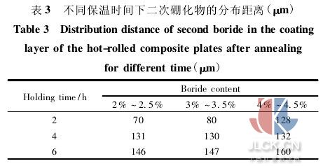 結(jié)合圖4、表3可以看出,隨著芯層硼含量的升高,同樣保溫時間下二次硼化物的分布距離增加,但這種變化的程度并不大。這是由于,一方面,隨著硼含量的增加,芯層中細小的共晶硼化物以及二次硼化物的數(shù)量是明顯增加的。這些硼化物可能隨著硼原子的擴散,部分溶解到基體中,因此有利于擴散的進行。另一方面,過共晶硼化物在保溫過程中基本不會出現(xiàn)局部向基體中溶解的過程。在硼原子從界面向覆層的擴散過程中,基本上不受到中間層組織中的過共晶硼化物的影響。所以,硼原子的擴散速率隨著中間層硼含量的增加而變化的程度不大。